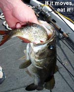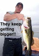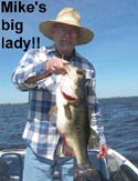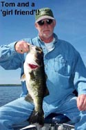 Mike and Tom must have arrived at the right time. It appeared as though the bass were starting training for the Fishy Olympics high jump and shiner-blasting contest. Mike was in the 'lucky seat' this day, as the bigger bass seemed to gravitate to his end of the boat. He caught a number of big old girls and I had a hard time deciding which picture to use. I finally settled on his Big Lady, who still had one heck of a potbelly, even though she was obviously spawned out. That belly is always an indicator of a truly BIG bass. One they get to around 10 pounds, the lengths of big bass varies little. The extra mass, as they get larger and larger, is nearly always contained in the girth. You can compare it to Bubba down at Bunny and Fluffy's bar. He may not have eaten in awhile, but that big old gut will still be hanging over his Big Smith work pants. Just from seeing that, you KNOW Bubba is a pretty big boy.