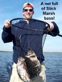 We let the wind drift us across the west-central section of the Stick Marsh, hooking fish after fish, while trying to keep them out of all the brush beneath the water. It soon became apparent that a heavy action, 7-foot rod with 17-20 lb. line was the ticket for this location. I fished off the backside, away from my clients, and got bit well. The problem was that my medium-heavy spinning rods, being only 6-feet long, failed to give me the leverage to immediately get the fish up on top of the water and too keep it there. Even with the no-stretch feature of my Fireline, a number of the bass hung me up. But, the truth of the matter is that short of a winch and steel cable, it is really difficult to get the big bass out of all that submerged brush and timber.