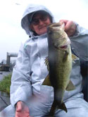 Jeff and Jack Bergdorf brought the gift certificate for the fishing day and cashed it in on a bass trip. I have to admit, it was a tough day. The weather was about as bad as it gets – cold, steady rain all day, with a good bit of wind to pound on us. That made it very difficult to fish any open water places, so we scratched around looking for some fish. We finally wound up down in the southeast corner of the Farm at the gate. As out luck went, the water was not running much and the fish were not working the current. So, we opted for the eddy water trick and a free-lined shiner. Suddenly, we were popular with the bass. Most were just good-catching bass, but Jack bounced in there with a really nice one right as the shiners ran out.